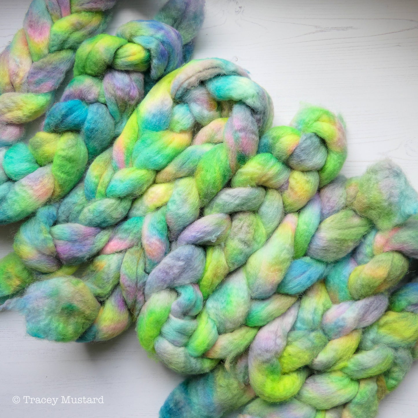 These 100% British BFL fibre tops have been dyed in various greens, blues, and purples.