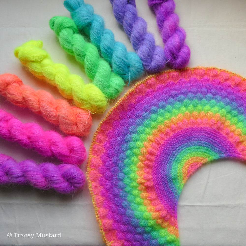 This 'usual' gradient I do is 7 skeins, starting with Neon Pink and ending with Neon Purple - I have added a mix of those two dyes to this bundle or create a Neon Magenta, which completes the circle and means you can work it continuously if you so wish (but you don't have to, of course!).
