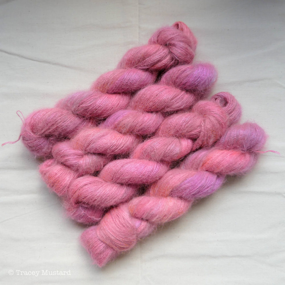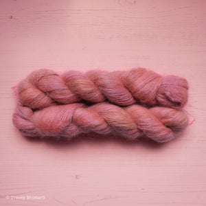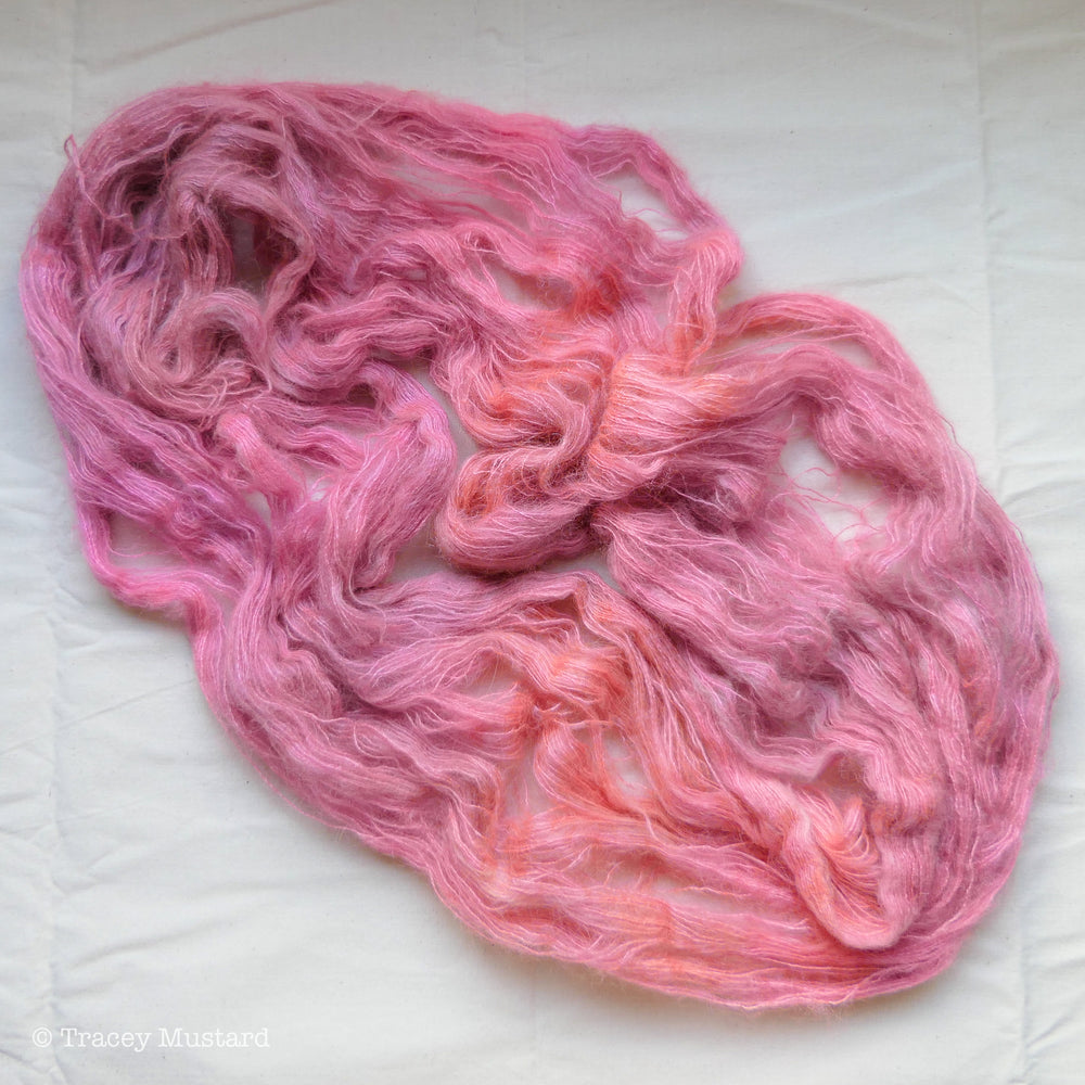 This mohair tonal colourway is a beautiful peachy dusky rosey mauvey kind of colour, some of the layers of dye contain neon dye.