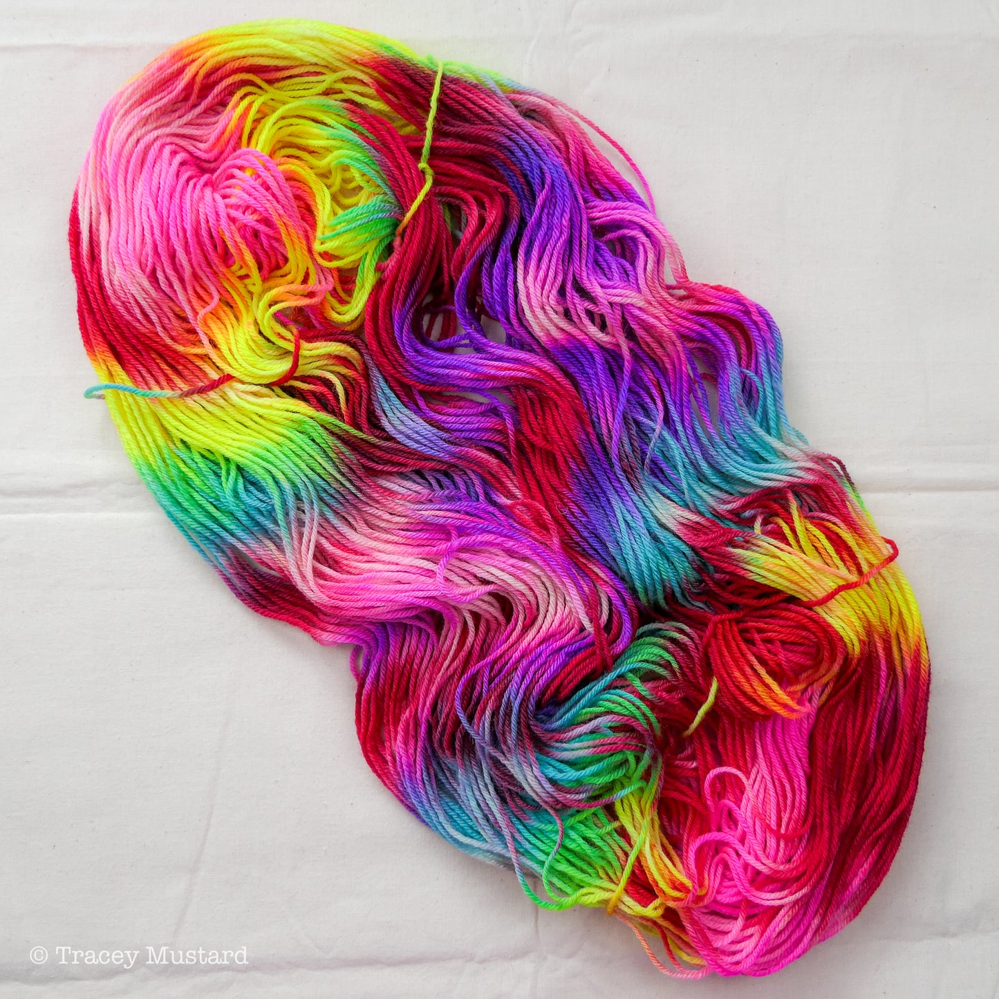 This colourway is kind of a remix of Lumina: Vibrant Red (which I actually no longer have available, and I've no idea why... I may re-dye it soon to rectify this!) - it's dyed with a variegated neon rainbow mixing in alongside splashes of vibrant red. Where the dyes meet, other beautiful colours are magically created.